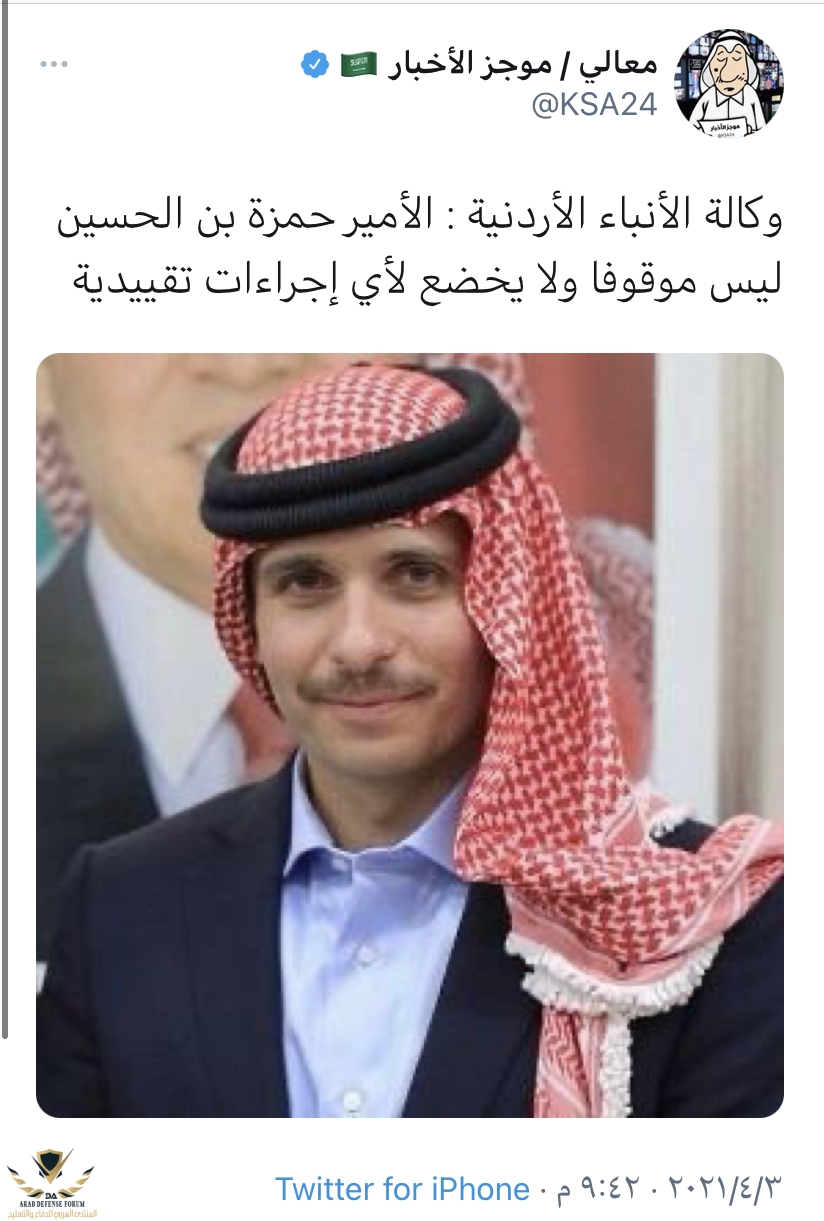 الأردن واستقراره في إطار تحقيقات شاملة مشتركة قامت بها الأجهزة الأمنية، واعتقل نتيجة لها الشريف حسن بن زيد وباسم إبراهيم عوض الله وآخرون. أكد أمين عام منظمة التعاون الإسلامي، الدكتور يوسف العثيمين، وقوف المنظمة ومساندتها لجميع الإجراءات التي يتخذها العاهل الأردني الملك عبدالله الثاني بن الحسين، وولي عهده الأمير الحسين بن عبدالله. أعلن رئيس الأركان المشتركة في الجيش الأردني اللواء الركن يوسف أحمد الحنيطي، اليوم السبت، اعتقال الشريف حسن بن زيد ورئيس الديوان الملكي السابق باسم إبراهيم. اعتقال الشريف حسن بن زيد وباسم عوض الله وآخرين لأسباب أمنية. وشغل حسن بن زيد منصب مبعوث الملك الأردني السابق إلى السعودية فيما شغل عوض الله مناصب عديدة منها رئيس الديوان الملكي في الفترة بين.